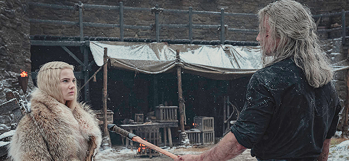В конце тренировка Цири рассмешила. Это плохо, потому что сцена подразумевалась серьезной. Но как не смеяться, если опытный ведьмак учит ее движениям так, что его руки скрыты его спиной от Цири...