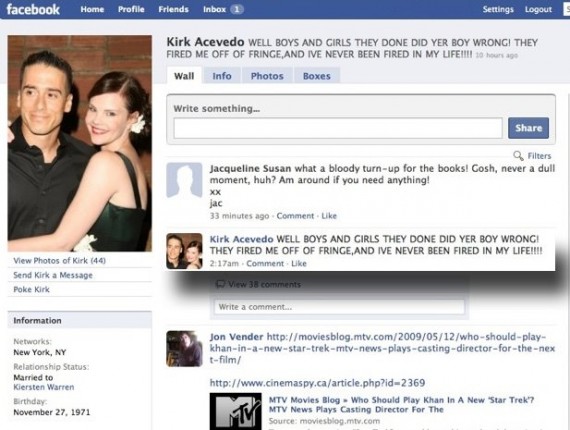 На своей странице в статусе он написал: «ЧТО Ж МАЛЬЧИКИ И ДЕВОЧКИ, ОНИ СОВЕРШАЛИ СЕРЬЕЗНУЮ ОШИБКУ УВОЛИВ МЕНЯ ИЗ FRINGE!!! МЕНЯ ЕЩЕ НИКОГДА В ЖИЗНИ НЕ УВОЛЬНЯЛИ!!!»